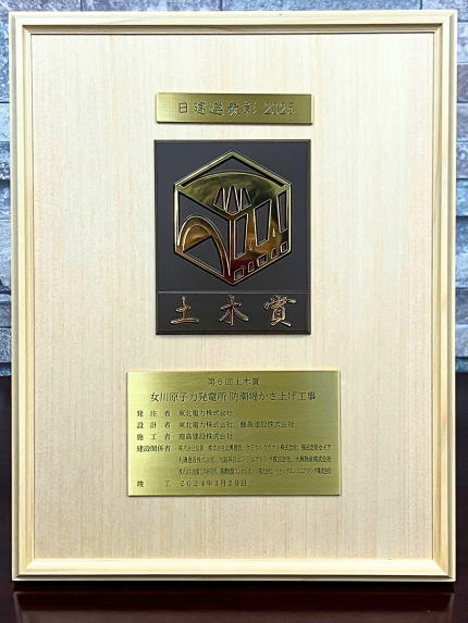 この度、当社が施工に携わりました「女川原子力発電所 防潮堤かさ上げ工事(宮城県牡鹿郡女川町~石巻市)」が、「東日本大震災被災地で安全性向上を追求し続けた国内最高レベルの防潮堤建設工事」として一般社団法人日本建設業連合会が主催する日建連表彰2025において「第6回土木賞」を受賞いたしました。