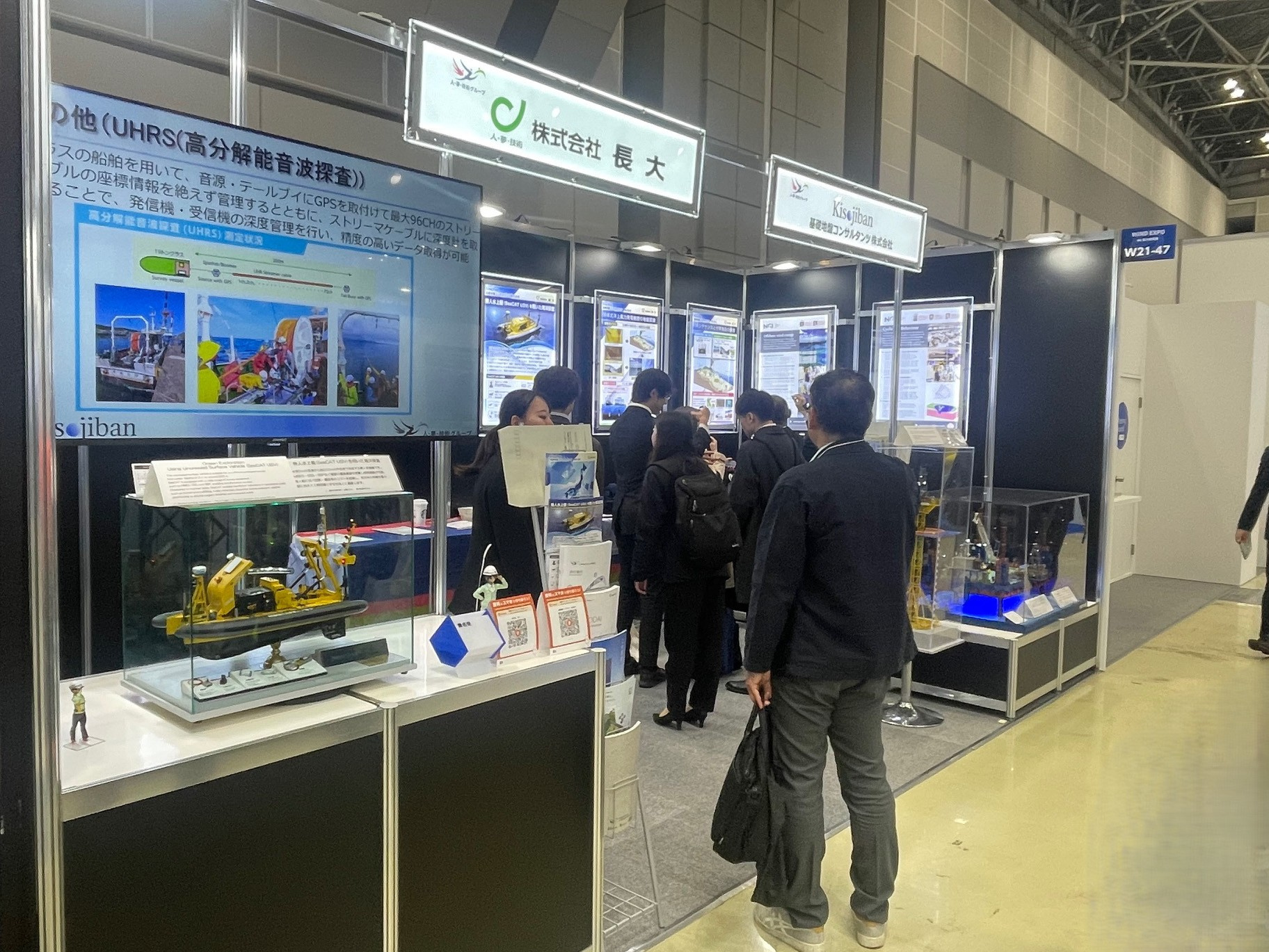 会期中は、発電事業者・設計施工会社・メーカー・官公庁など、多様な立場の来場者(約200名)にご来訪いただき、活発な意見交換が行われました。特に、洋上風力分野における基礎地盤の既存顧客に対し、長大の得意分野である環境アセスメント対応や地盤リスク評価の重要性を紹介することにより、人・夢・技術グループとしてのワンストップサービスについて多くの共感と関心を得ることができました。また、技術的な意見交換に発展することもあり、単なるPRにとどまらない実務的な交流の場ともなりました。