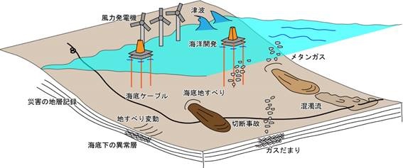弊社は日本沿岸域において洋上風力発電事業を発展させるためには、これらの海底地質リスクの評価が重要であると考えました。日本の沿岸域において海底地盤のジオハザードと地質リスクの評価技術は確立されていません。そこで、海底地質リスクの抽出・評価技術を確立するとともに、事業者の皆様にリスク評価サービスを提供することを目的として、この分野のトップランナーの一人である山口大学(川村喜一郎准教授:大学院創成科学研究科)と海底地質リスク評価に関する共同研究契約を締結しました。海底地質リスクの抽出・評価マニュアルの作成を今年度中の完成を目指しています。